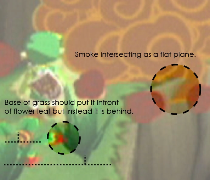 A closer look at the graphic can help reveal imperfections of this rendering technique. Take a look at the puffs of smoke about the character and to the left. Notice that one sprite at the bottom of the largest puff of smoke is cutting into the ground, revealing its actual geometry is not an amorphous puff but a flat plane. Also notice that the grass near his feet is interacting with the flower near his feet in a strange way. The base of the grass is closer to the camera than the flower yet the blades appear to be behind. For this to be a correct perspective the grass would have to be leaning toward the ground away from the camera at an obtuse angle. Even though the original image that created the grass sprite was clearly created using textured polygons, it is being added to this scene as a sprite. These imperfections escape the notice of most viewers because they are rare, and often do not last very long as they and the camera move.
